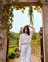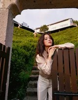 环境成为这组作品中不可或缺的“共演者”。斑驳的木门、素雅的砖墙、郁郁葱葱的庭院绿植,这些充满岁月感和生命力的元素,与欧阳娜娜自然的状态相得益彰。摄影师巧妙运用自然光线,让每一帧画面都弥漫着夏秋之交特有的柔和光感与透明空气,共同编织出一个让人心生向往的避世桃源。这种对自然与场景的极致利用,与她此前那些令人印象深刻的外景拍摄一脉相承。